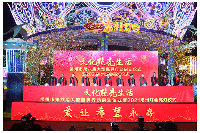 | 12月17日晚,环球恐龙城迪诺水镇华彩绽放、流光溢彩,万盏花灯同时点亮,由中共常州市委宣传部、市文化广电和旅游局、市文联、龙城产业投资控股集团有限公司联合主办,常州日报、常州广播电视台协办的常州市第六届“文化点亮生活”大型惠民行动暨2021常州灯会 |