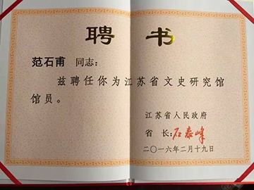 | 近日,省政府参事、省文史研究馆馆员聘任仪式在南京举行。我市书画家范石甫受聘成为省文史研究馆新聘馆员,全省共20位,常州仅1人。