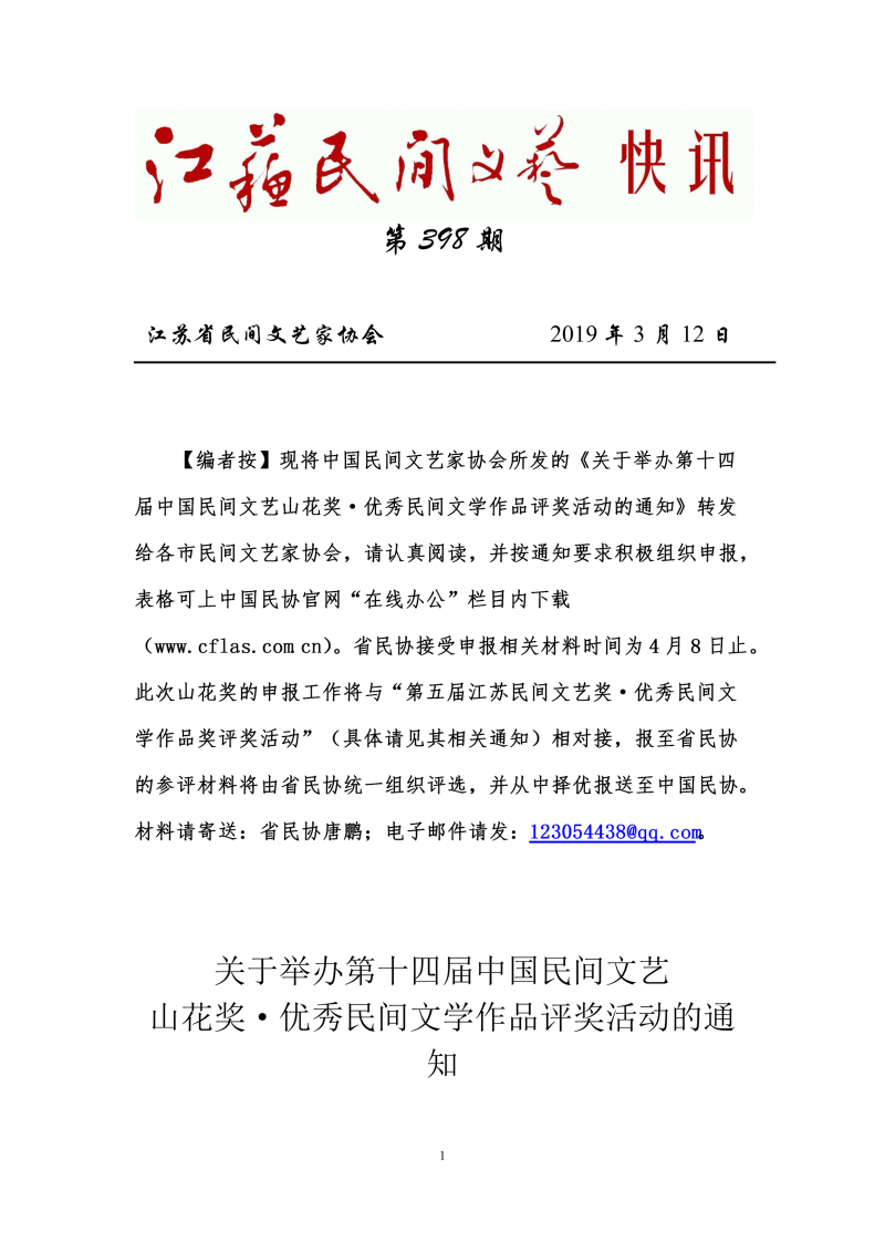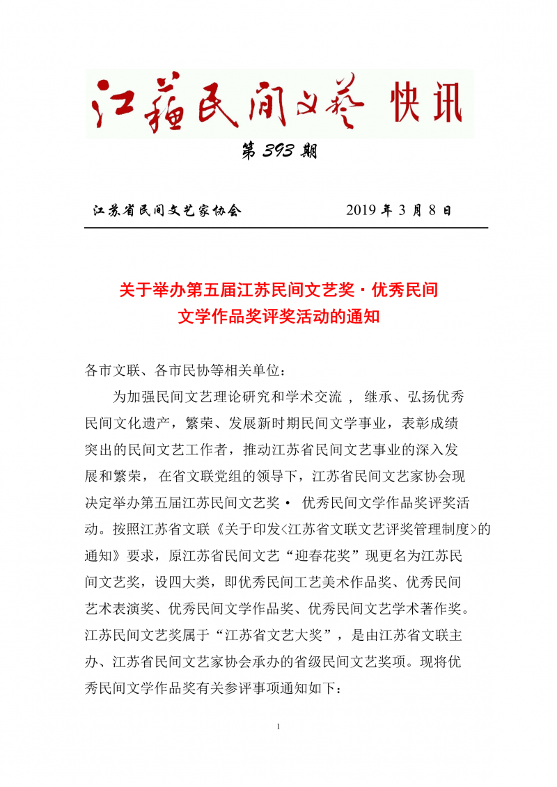关于举办第五届江苏民间文艺奖•优秀民间文学作品奖评奖活动的通知