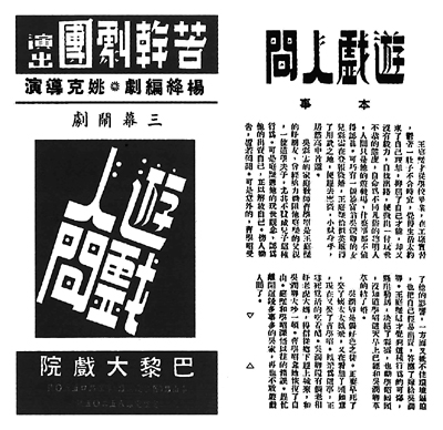 | 上海苦干剧团一九四四年在上海巴黎大戏院上演杨绛所编话剧《游戏人间》(姚克导演)的说明书