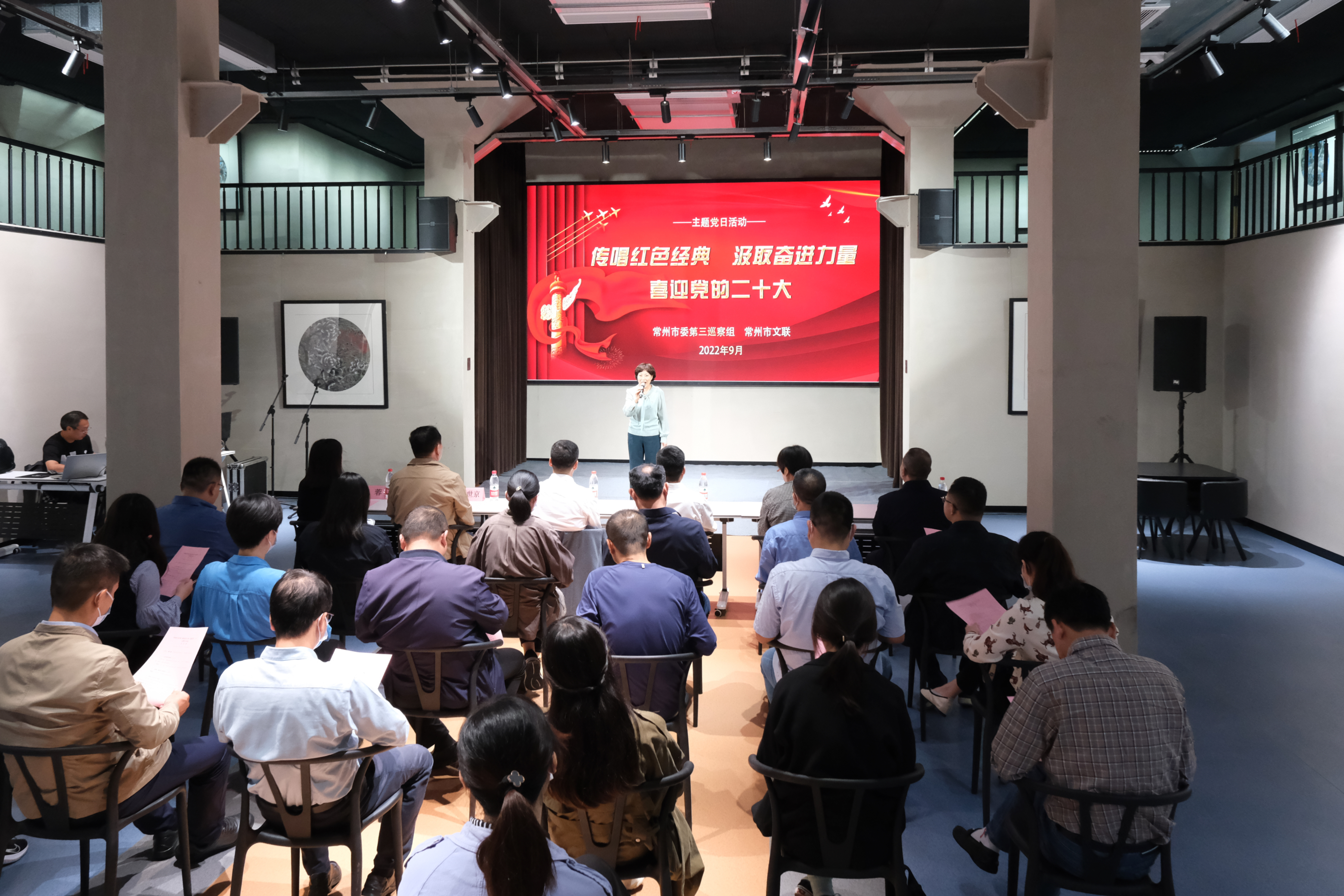 | 9月28日下午,由市委第三巡察组、市文联联合开展的“传唱红色经典 汲取奋进力量 喜迎党的二十大”主题党日活动在捌伍当代艺术馆顺利举办。市委第三巡察组组长芮卫东,市文联党组书记、主席舒文,市委第三巡察组和市文联的党员干部参加活动。