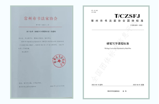 | 经国家市场监督管理总局审核通过,常州市书法家协会《硬笔写字课程标准(T/CZSFJ001—2022)》,由国家质检总局、国家标准化管理委员会、民政部联合在全国团体标准信息平台上正式发布,自2022年6月1日起实施。这是全国首个关于硬笔写字课程的团体标准。