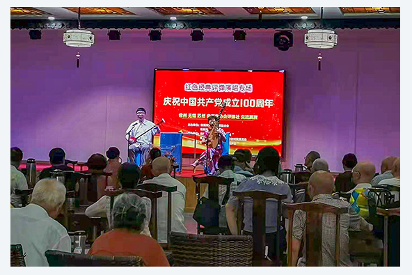 | 为庆祝中国共产党成立一百周年,传承红色经典,弘扬红色文化,5月15日下午,苏锡常三地曲艺家协会的会员齐聚常州新中书场,为常州听众带来了《蝶恋花》《王孝和选段·写遗书》《紧握手中五尺枪》《芦苇青青选段·望芦苇》等红色经典评弹曲目。