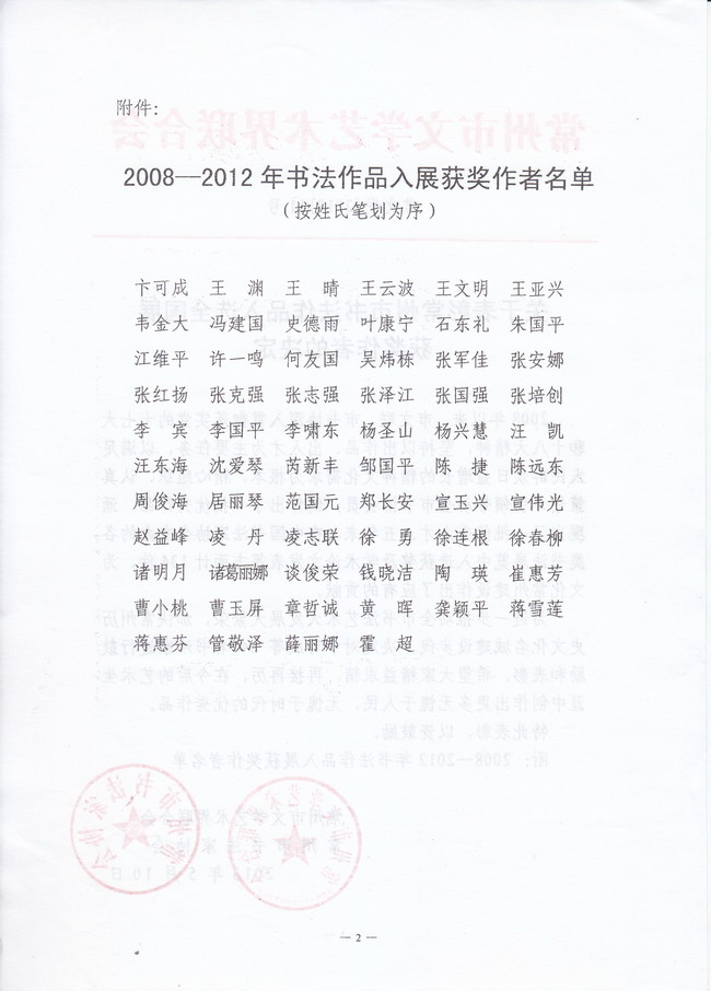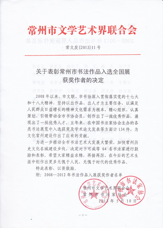 表彰市书法作品入全国展获奖作者