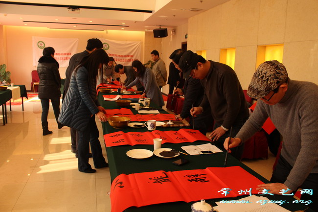 春节期间,在市文联主席荣凯元先生的带领下,市书协主席叶鹏飞、名誉主席刘秋农以及市花鸟画研究会会长戴德培,一行16人来到武进遥观镇得园房地产有限公司开展“常州市文联志愿者服务团”活动。书画家们冒着严寒为该镇村民送写了百余幅春联,并与部分书画爱好者一起交流技艺、现场创作书画作品。