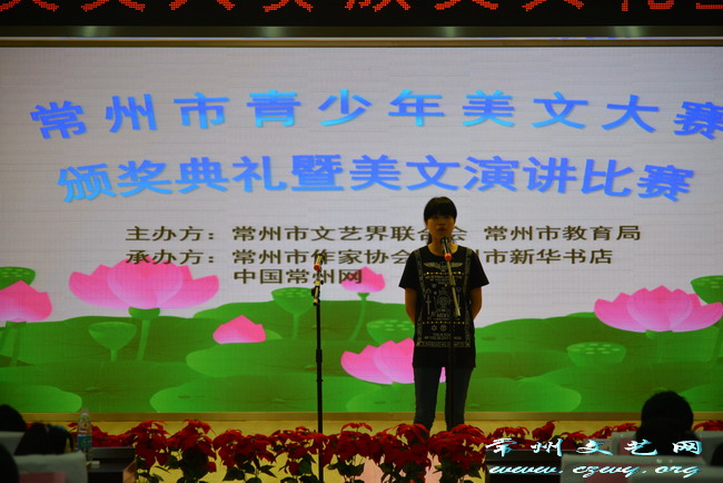 经过当场评选,来自解放路小学的尹宣懿、常州幼儿师范学校的高婧仪、常州工学院的侯经纬、倪万俐获得美文演讲比赛的一等奖,其他选手分别荣获二三等奖。市文联副主席、市作家协会主席胡军生,市作家协会秘书长、常工院人文学院副院长陆克寒,市教育局德育处处长肖志民,市作家协会副秘书长、钟楼区教育文体局党委书记徐澄范,市新华书店副总经理李伟,中国常州网编辑聂红,市作家协会副秘书长李萍等领导为获奖选手颁奖,胡军生主席对本次活动作了总结,他鼓励同学们漫游书海,品味书香,为繁荣文学作出努力。