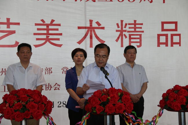 徐缨在讲话中说,工艺美术反映时代之美,这次工艺美术精品展,大家不仅能欣赏到梳篦、留青竹刻和乱针绣这著名的“常州三宝”,还有牙刻、剪纸、雕塑、烙画、彩绒画等多种门类作品。常州工艺美术家在继承传统技艺的基础上开拓创新,创作了一大批反映时代精神、体现高端水平的精品力作,形成工艺美术领域百花齐放、欣欣向荣的生动局面;工艺美术点亮生活之美,作为“精彩龙城—文化100”惠民活动中的重头戏之一,也是常州文艺界践行群众路线的实际行动之一,今天举办的工艺美术精品展就是要敞开大门,为广大市民奉上精神大餐和视觉盛宴,让广大市民分享常州文化繁荣发展的优秀成果;工艺美术传递精神之美,常州的工艺美术有着深厚的历史渊源和丰富的文化内涵。这次展出的作品,都是常州工艺美术大师们的精心之作、上乘之作,构思上独运匠心,工艺上精益求精,内涵上丰富多彩,既是历史文化的展示,也是现实生活的写照,更是对美好未来的向往,传递的都是向上的精神和满满的正能量。