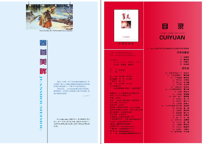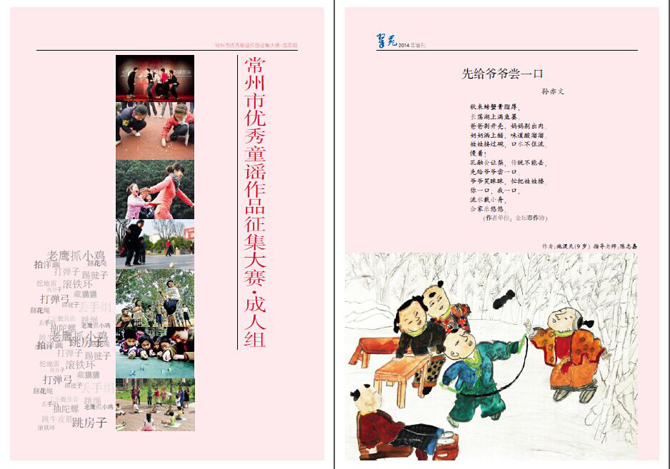 近日,常州翠苑杂志社有限公司推出2014年童谣增刊。增刊将市文明办、市教育局、市文联、市语委共同组织开展的“放飞梦想”2014年度全市优秀童谣征集活动中的优秀童谣汇编,并融入市文联艺术活动中心征集到的优秀儿童画作,图文并茂,童趣盎然。