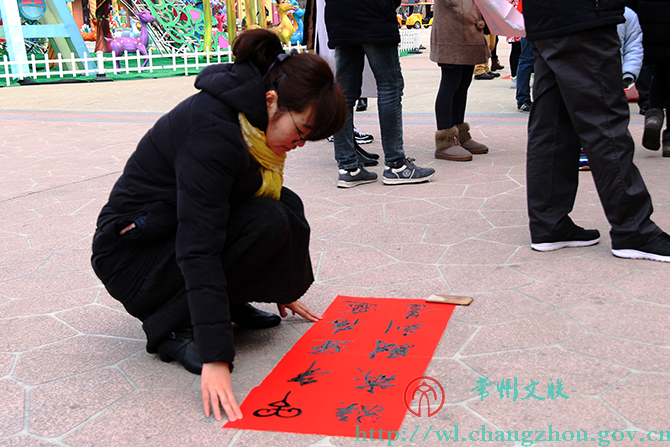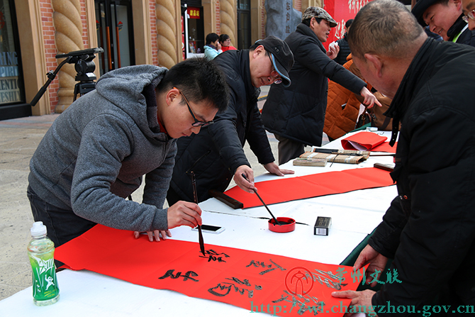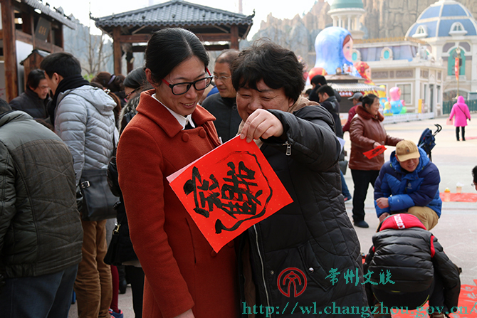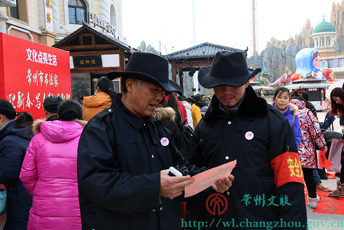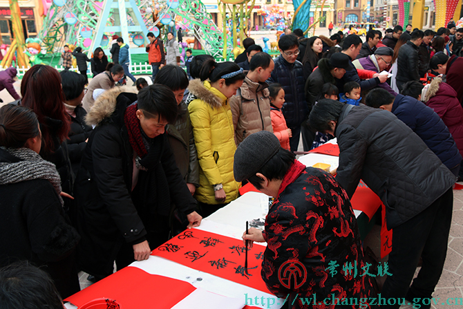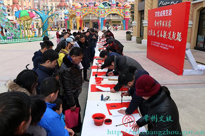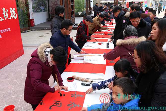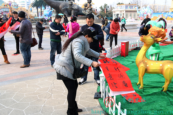 1月30日下午,环球恐龙城迪诺水镇人头攒动、热闹非凡,来自常州市书法家协会的20位书法家们挥毫书写着不同字体的春联。