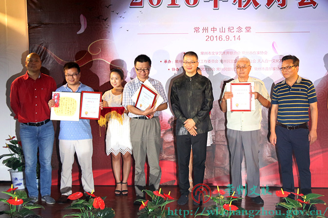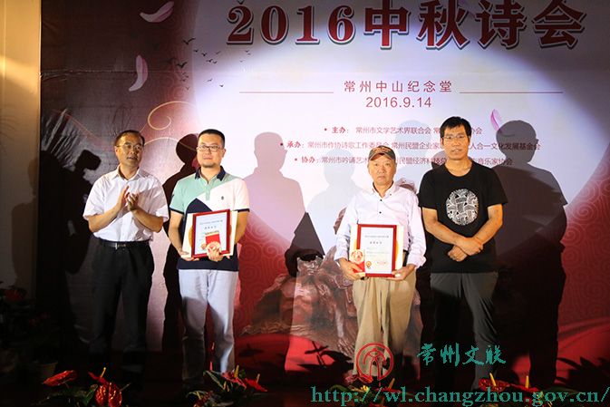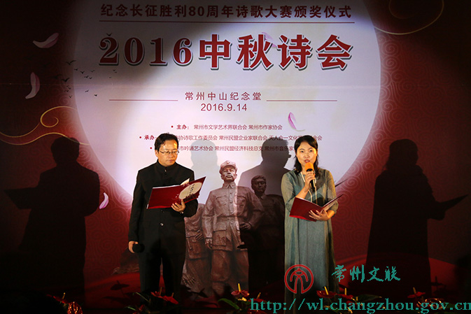 9月14日晚,由常州市文联、常州市作协主办,天人合一文化发展基金会等承办,常州市音乐家协会、常州市吟诵艺术协会等协办的纪念长征胜利八十周年诗歌大奖赛颁奖仪式暨常州市中秋诗会在中山纪念堂举行,原常州市人大常委会副主任、民盟市委原主委赵忠和,市委宣传部副部长朱明辉,市文联党组书记、主席荣凯元,副主席胡军生,秘书长沙滩及著名诗人、作家《十月》杂志编辑部主任谷禾,《钟山》杂志主编贾梦玮等出席活动,来自全市的近百名诗歌爱好者齐聚一堂,以诗为媒,品味经典。