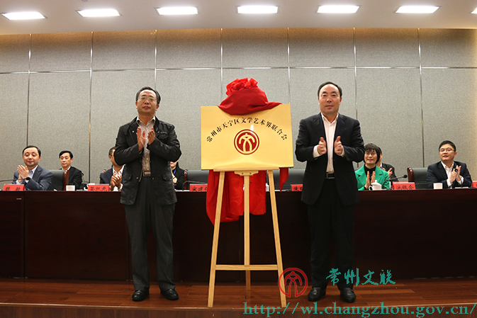 市委宣传部副部长朱明辉与区委书记宋建伟共同为新成立的区文联揭牌。