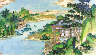 到得水边,正是贾母那边笛声呜呜咽咽,悠悠扬扬。“二人遂在两个湘妃竹墩上坐下。只见天上一轮皓月,池中一轮水月,上下争辉,如置身于晶宫鲛室之内。微风一过,粼粼然池面皱碧铺纹,真令人神清气净。”二人望一会天上月,又望一会水中月,你一句我一句地吟起诗来。一只暗影中惊飞的白鹤,使史湘云如有神助,吟出“寒塘渡鹤影”。林黛玉也不甘示弱,对上一句“冷月葬花魂”。又有闻笛踏月而来的妙玉助兴,三人烹茶煮字,于月落未落之间,完成《右中秋夜大观园即景联句三十五韵》———