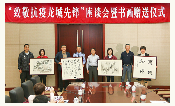 5月9日上午,由中共市委组织部、市文联联合举办的“致敬抗疫龙城先锋”座谈会暨书画赠送仪式在行政中心高远厅举行,我市书画家创作的130件书画作品赠予奋战在疫情防控一线的先锋模范,向他们表达崇高敬意。市委组织部副部长、党建办主任、两新工委书记安春燕,市文联党组书记、主席黄建德,“抗疫龙城先锋”及艺术家代表参加赠送仪式。