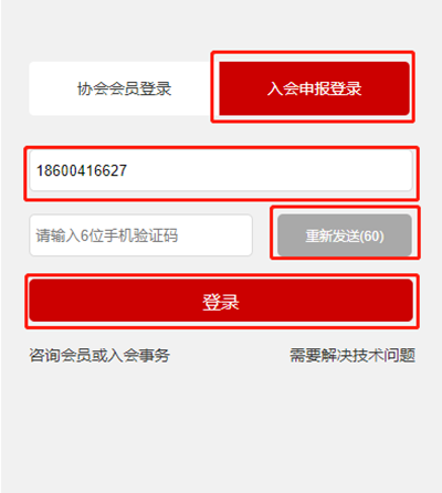 1、在登录页面点击入会申报登录。输入您的手机号码后,点击获取验证码按钮,系统会自动向您输入的手机号码发送6位数字验证码(验证码15分钟内有效,60秒后可重新获取),正确输入6位数字短信验证码,点击登录按钮,即可登录成功。登录后点击申报会员进入申报流程。