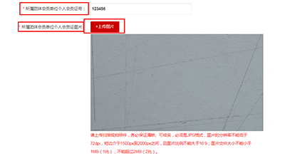 4) 上传“所属团体会员单位个人会员证图片”时,请仔细阅读下方红色说明文字,上传提示文字所要求的图片;
