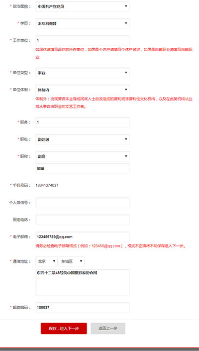 7) 通信地址中,所在省、市、区(县)等选择后,下方详细输入框无需重复输入。例如:北京市东城区东四十二条48号院中国摄影家协会。下方输入框只需输入“东四十二条48号院中国摄影家协会”即可。