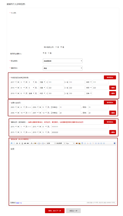 1)作品获奖及发表证明目录、主要从业经历、摄影经历等3项,请分别逐项填写,点击“继续添加”按钮,可添加多个项,点击“删除”按钮,可删除添加的项。每部分至少填写一项。