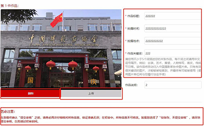 必须上传10幅申报入会摄影作品(数量少于10幅无法完成提交)。文件量不大于2M的摄影作品,仅限JPG格式。