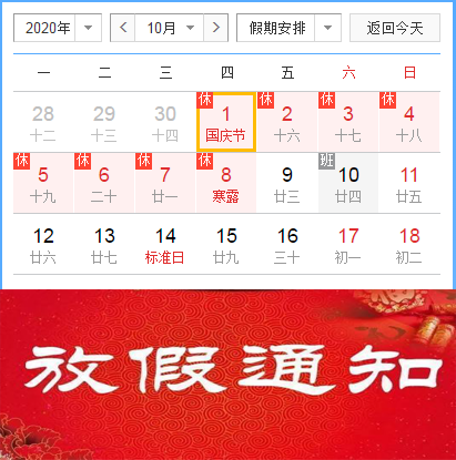 2020年国庆节放假安排:10月1日至8日放假调休,共8天。9月27日(星期日)、10月10日(星期六)上班。节假日期间,各部门要妥善安排好值班和安全、保卫等工作,如遇有重大突发事件,要按规定及时报告并妥善处置,建议大家假期外出做好防护,尽量不要跨省境旅游,确保祥和平安度过节日假期。