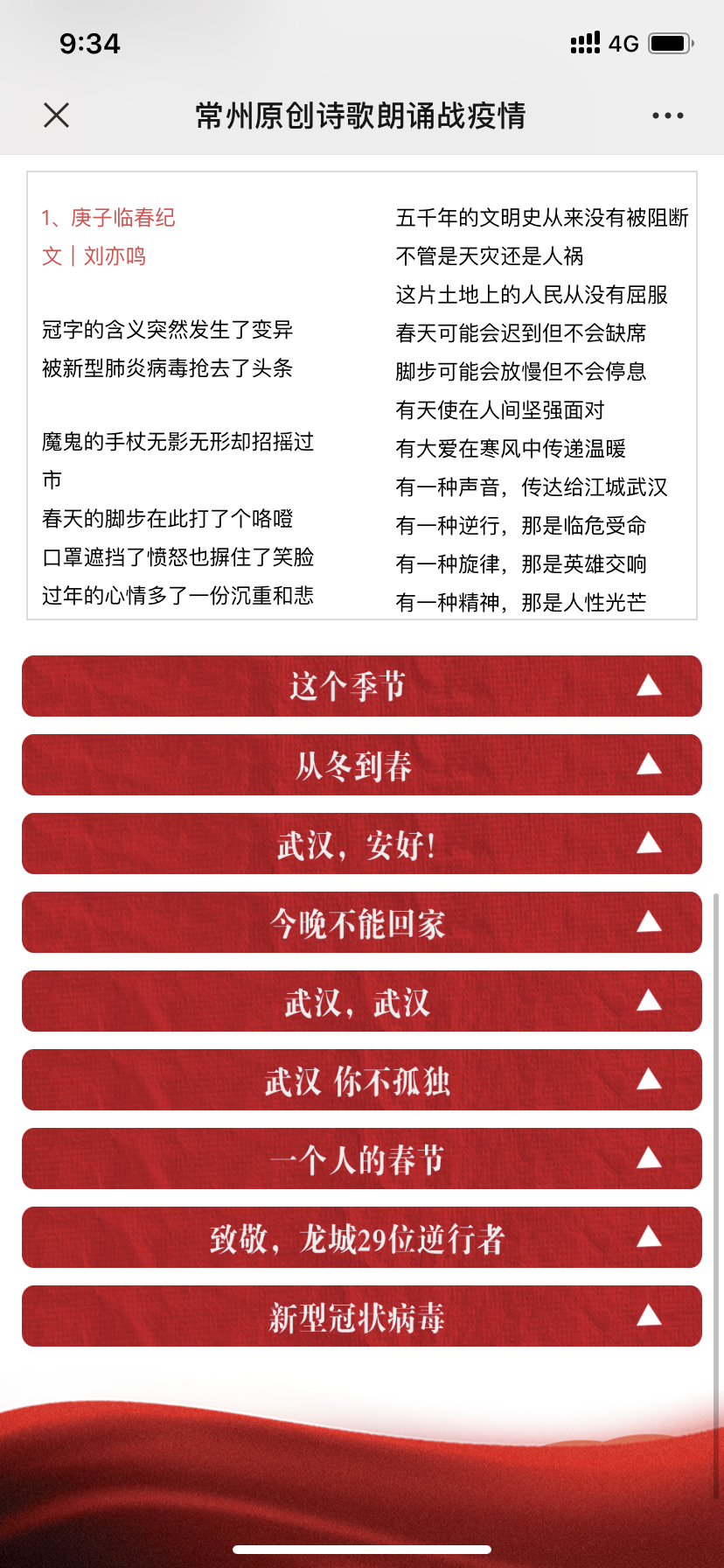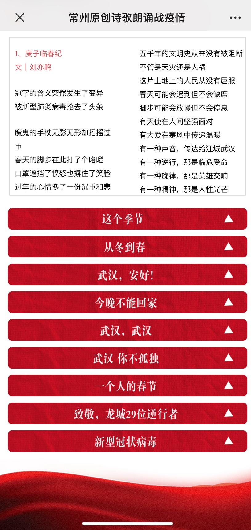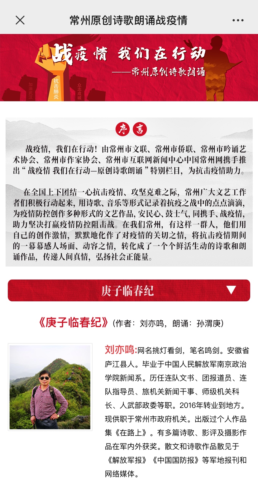 面对疫情,常州市作家协会组织会员投入到了这场抗击疫情的战斗中,用心、用情创作抗击疫情为主题的原创诗歌近百余首,用呈现“常州温度”的文字声援武汉,鼓舞士气,抚慰人心,讴歌大爱,为全国各地抗击疫情加油鼓劲。同时,与常州市吟诵艺术协会等携手推出“战疫情 我们在行动—原创诗歌朗诵”特别栏目,为抗击疫情助力。