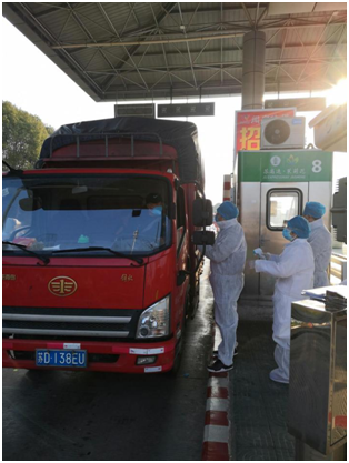 (沈程与陈斌、季洪斌三名检察干警在沿江高速常州南出口给过往司机测量体温)