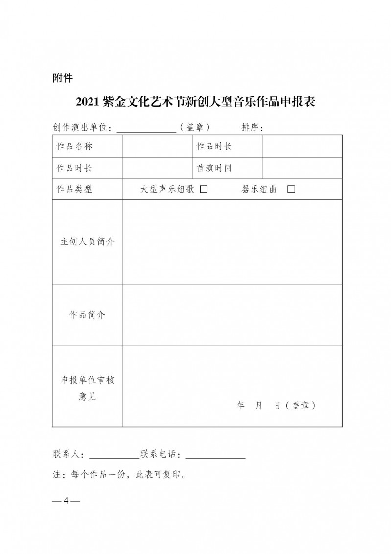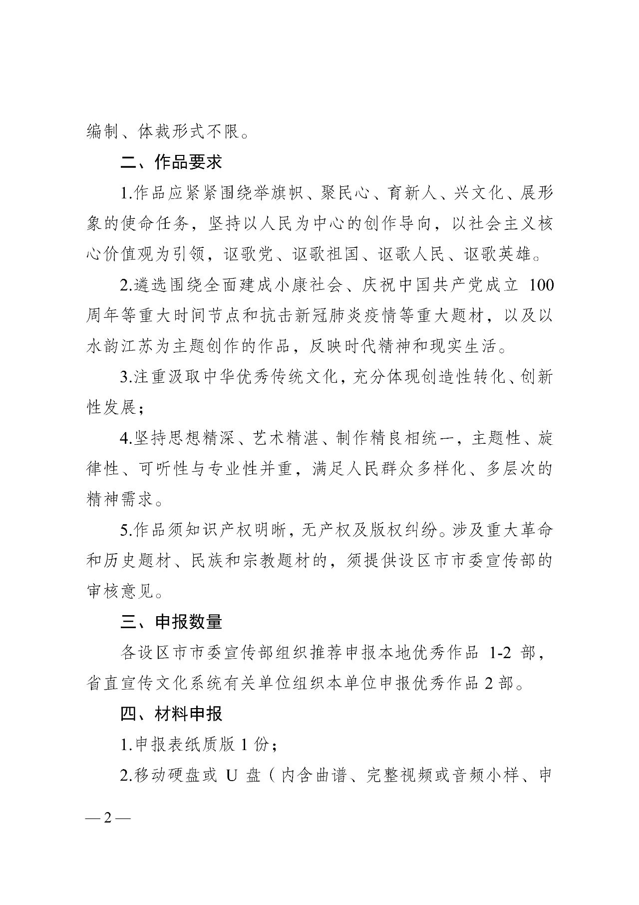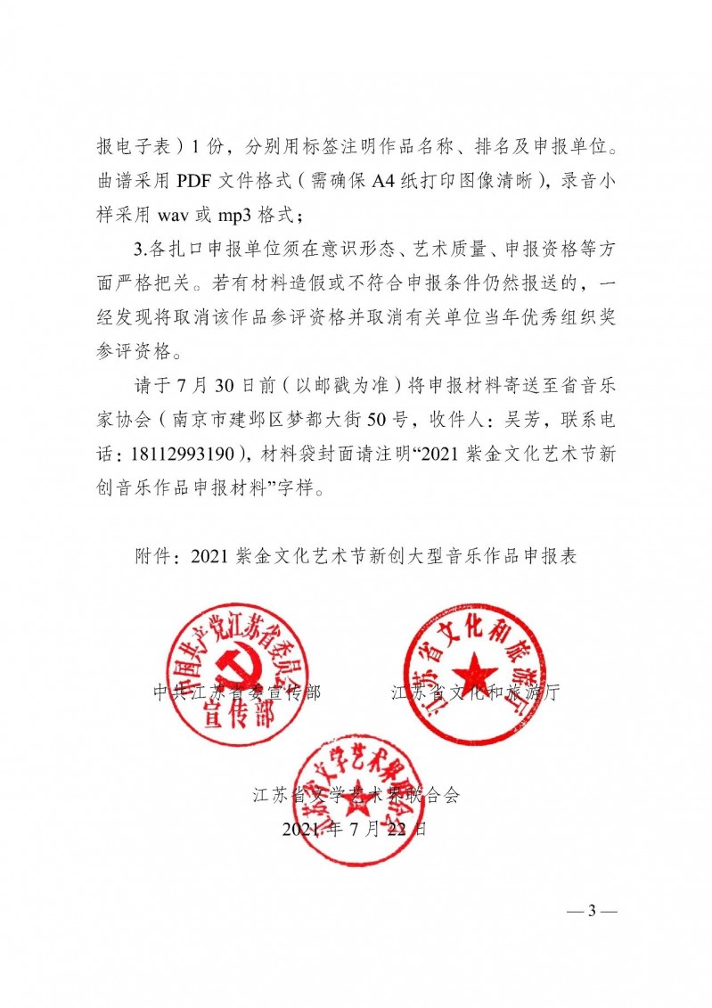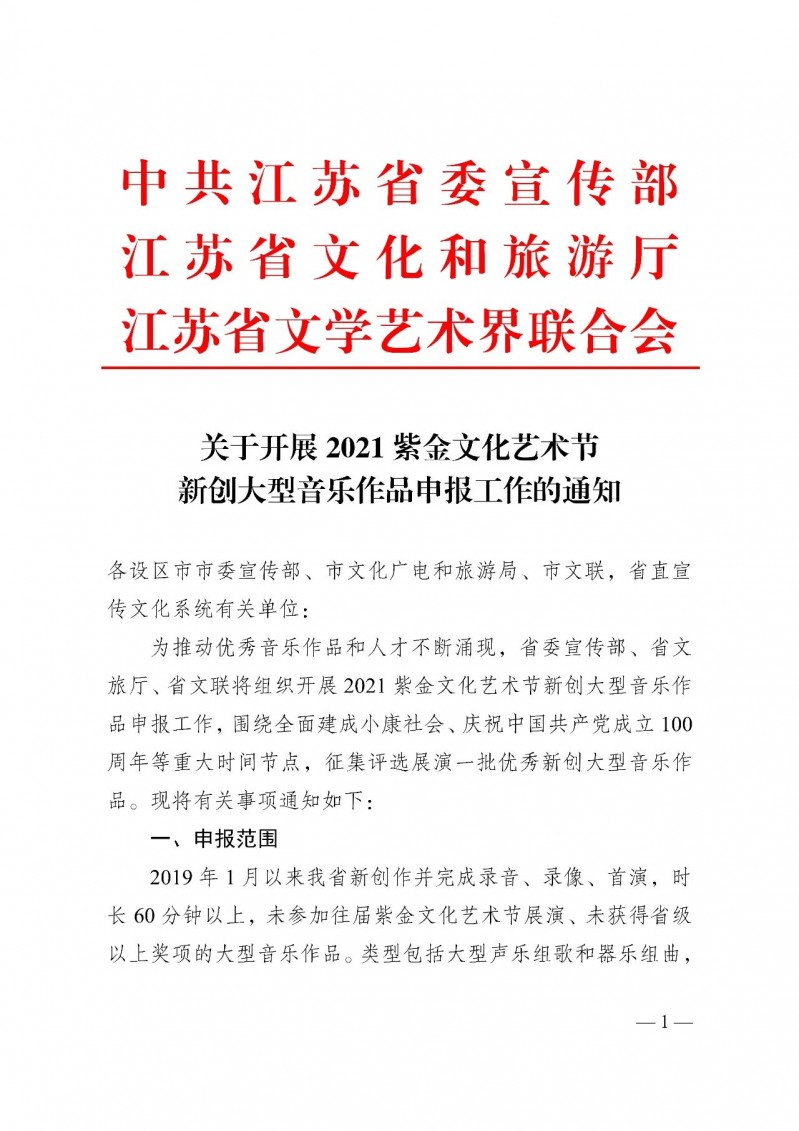 为推动优秀音乐作品和人才不断涌现,省委宣传部、省文旅厅、省文联将组织开展2021紫金文化艺术节新创大型音乐作品申报工作,围绕全面建成小康社会、庆祝中国共产党成立100周年等重大时间节点,征集评选展演一批优秀新创大型音乐作品。7月22日,省委宣传部、省文旅厅、省文联发出《关于开展2021紫金文化艺术节新创大型音乐作品申报工作的通知》,通知内容如下: