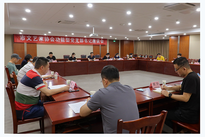 6月7日上午,市文联各文艺家协会功能型党支部书记座谈会在三楼召开,市文联党组成员、专职委员、党总支书记周勇刚,天宁街道青果社区党总支书记周文静,各协会功能型党支部书记、书协党支部书记及文联党总支部分委员20余人参加座谈。