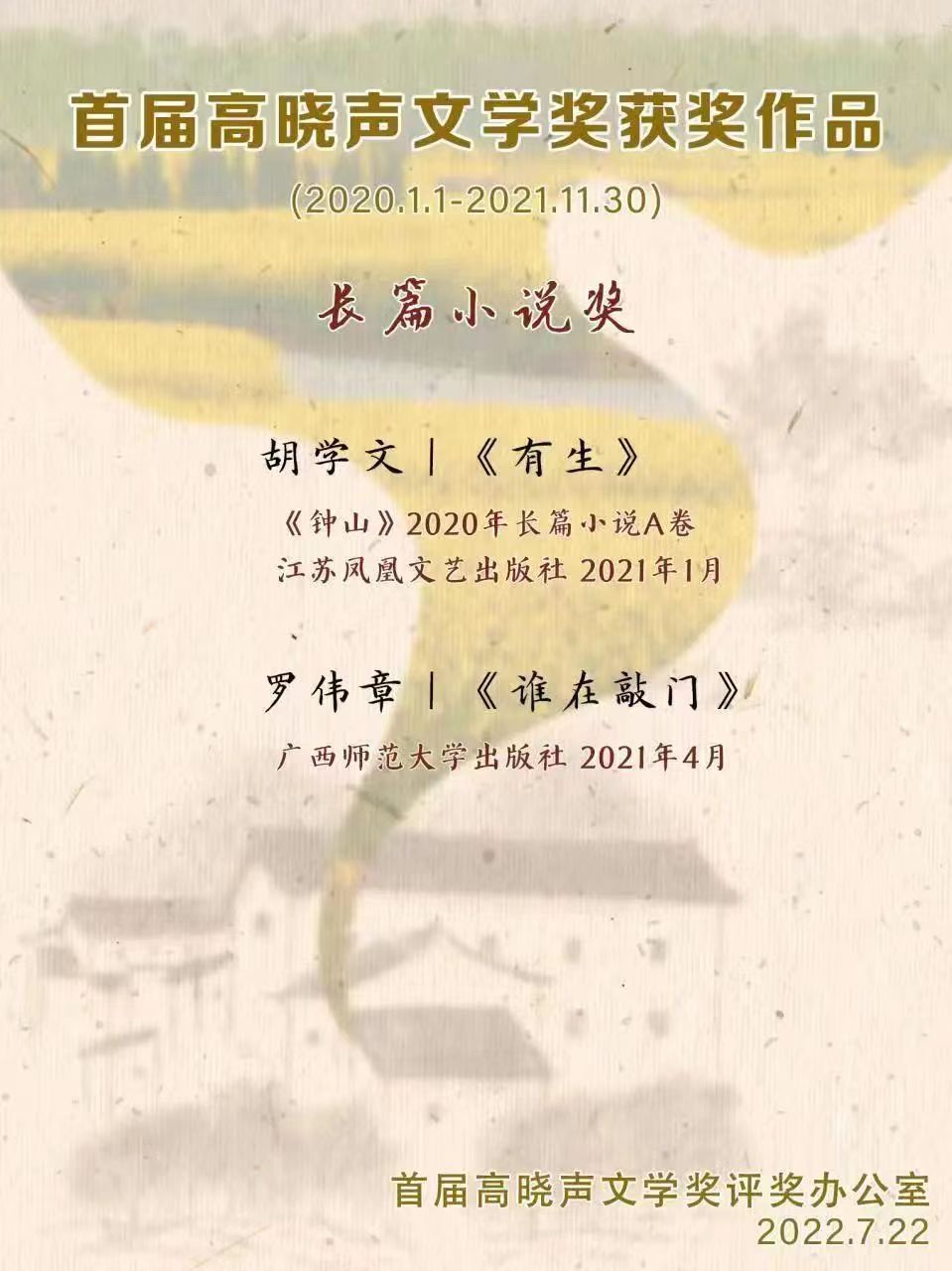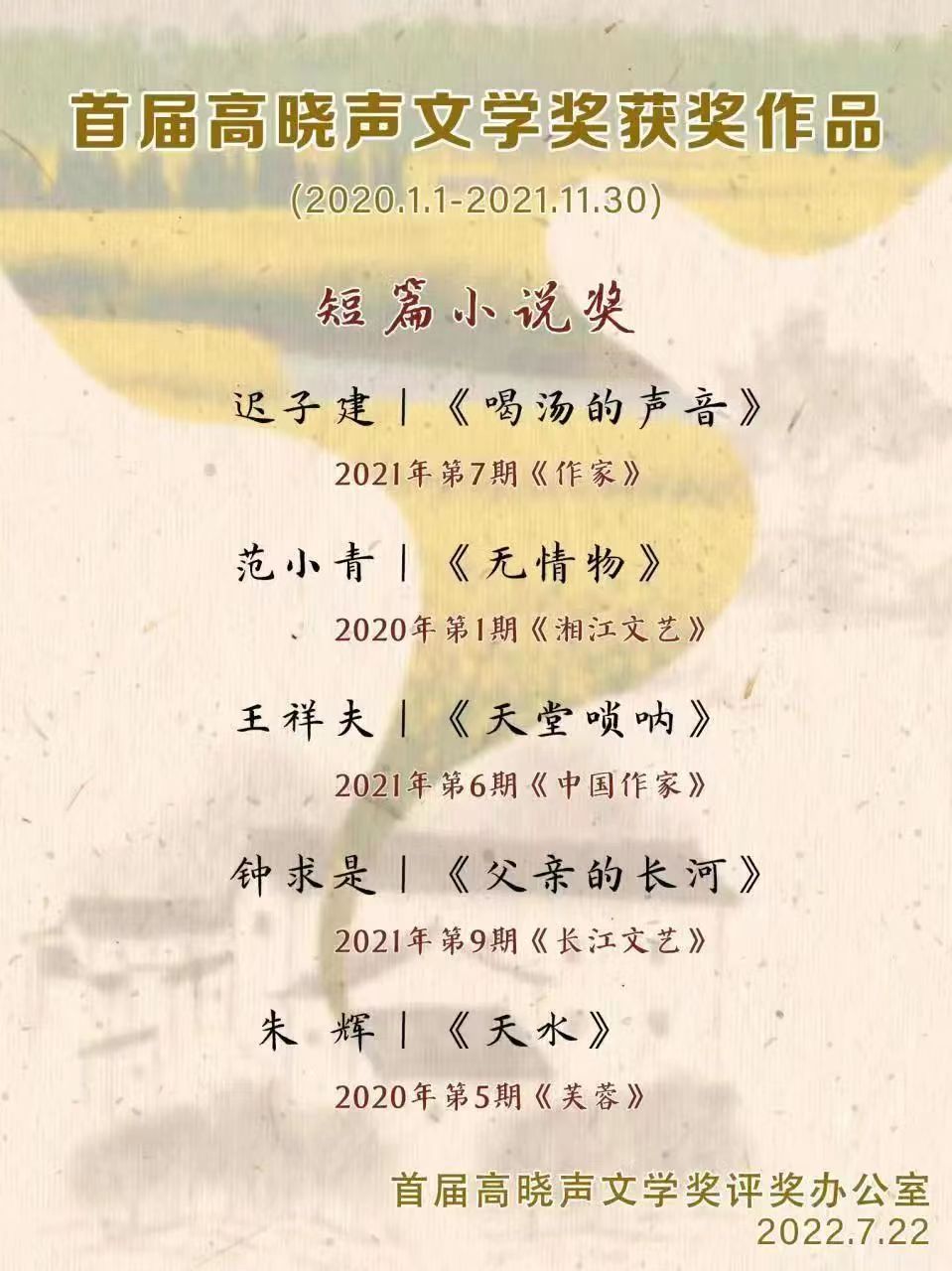 2022年7月22日上午,首届高晓声文学奖新闻发布会在市行政中心举行,《有生》《空山》《喝汤的声音》等10部(篇)作品分获长篇小说奖、中篇小说奖、获短篇小说奖。江苏省作家协会党组成员、书记处书记、副主席丁捷,常州市委宣传部副部长、市新闻出版局(版权局)局长谢春林,常州市文联党组书记、主席舒文,南京大学教授王彬彬,江苏凤凰文艺出版社原社长黄小初以及省内外二十多家新闻媒体记者出席发布会。发布会由常州市委宣传部四级调研员王志新主持。