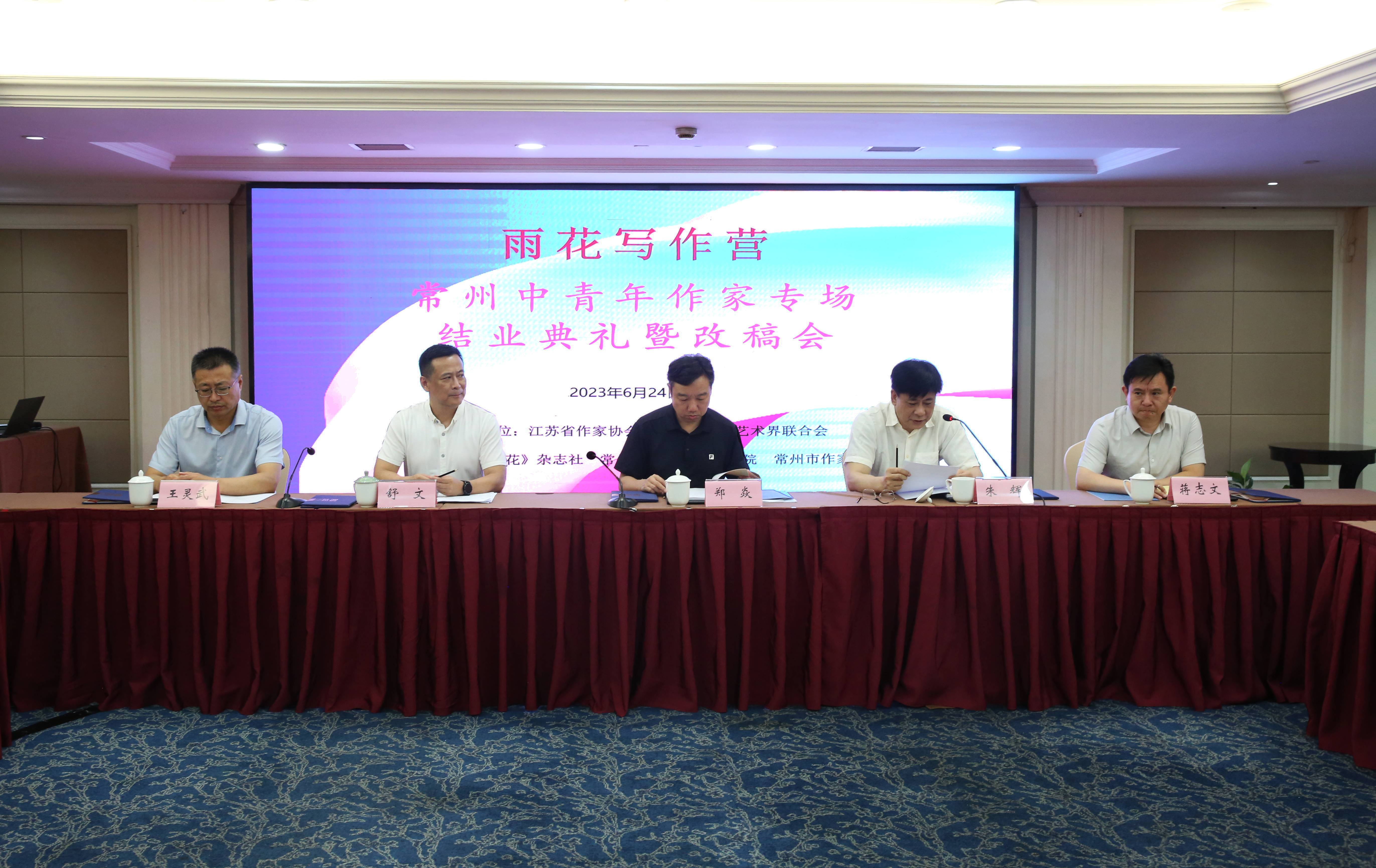 6月24日,雨花写作营——常州中青年作家专场结业典礼暨改稿会在常州举行。江苏省作协党组书记、书记处第一书记、常务副主席郑焱,常州市文联党组书记、主席舒文,常州市文联党组成员、副主席蒋志文,中共常州市委宣传部四级调研员、干部处处长王灵武出席结业典礼并为学员颁发结业证书。《雨花》主编朱辉、副主编育邦、《山西文学》主编鲁顺民、《安徽文学》主编李国彬、《福建文学》主编石华鹏、《收获》副主编谢锦等对学员提交的作品进行了细致点评。结业典礼和改稿会分别由朱辉和育邦主持。
