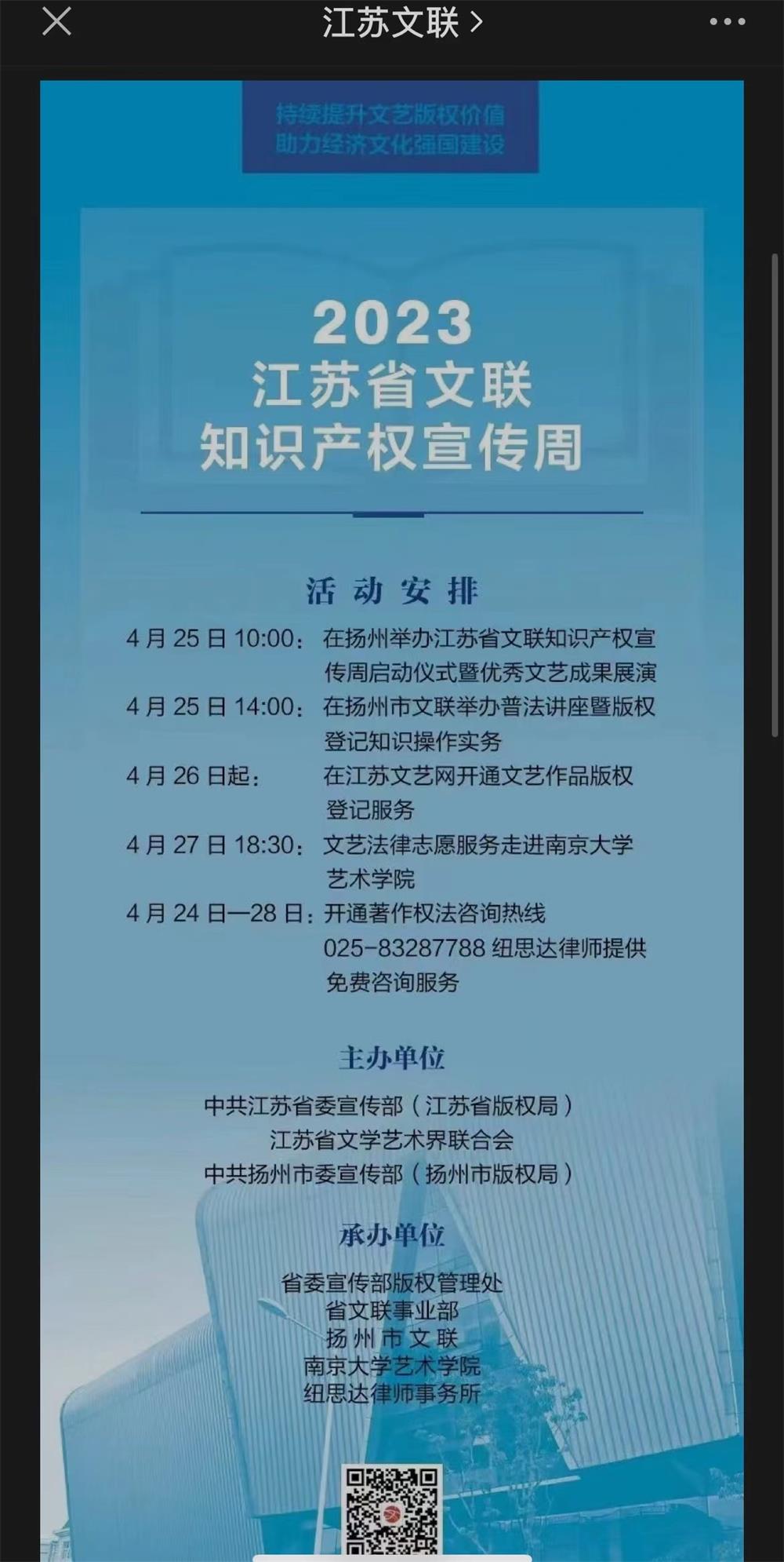 2023年4月26日是第23日世界知识产权日,为进一步激发全省广大文艺工作者的创新创造热情,依法维护广大文艺工作者合法权益,省文联特在2023·知识产权宣传周活动期间开通著作权法咨询热线,邀请专业从事知识产权法律保护工作的律师服务团队,为全省有维权需要的文艺工作者提供免费咨询服务。咨询热线:025-8328 7788。服务时间:上午8点30分-下午6点服务对象:江苏省文艺工作者服务内容:知识产权保护、文艺维权、著作权法等法律法规政策的咨询服务专家团队:纽思达律师事务所如果您有需要,欢迎来电咨询!