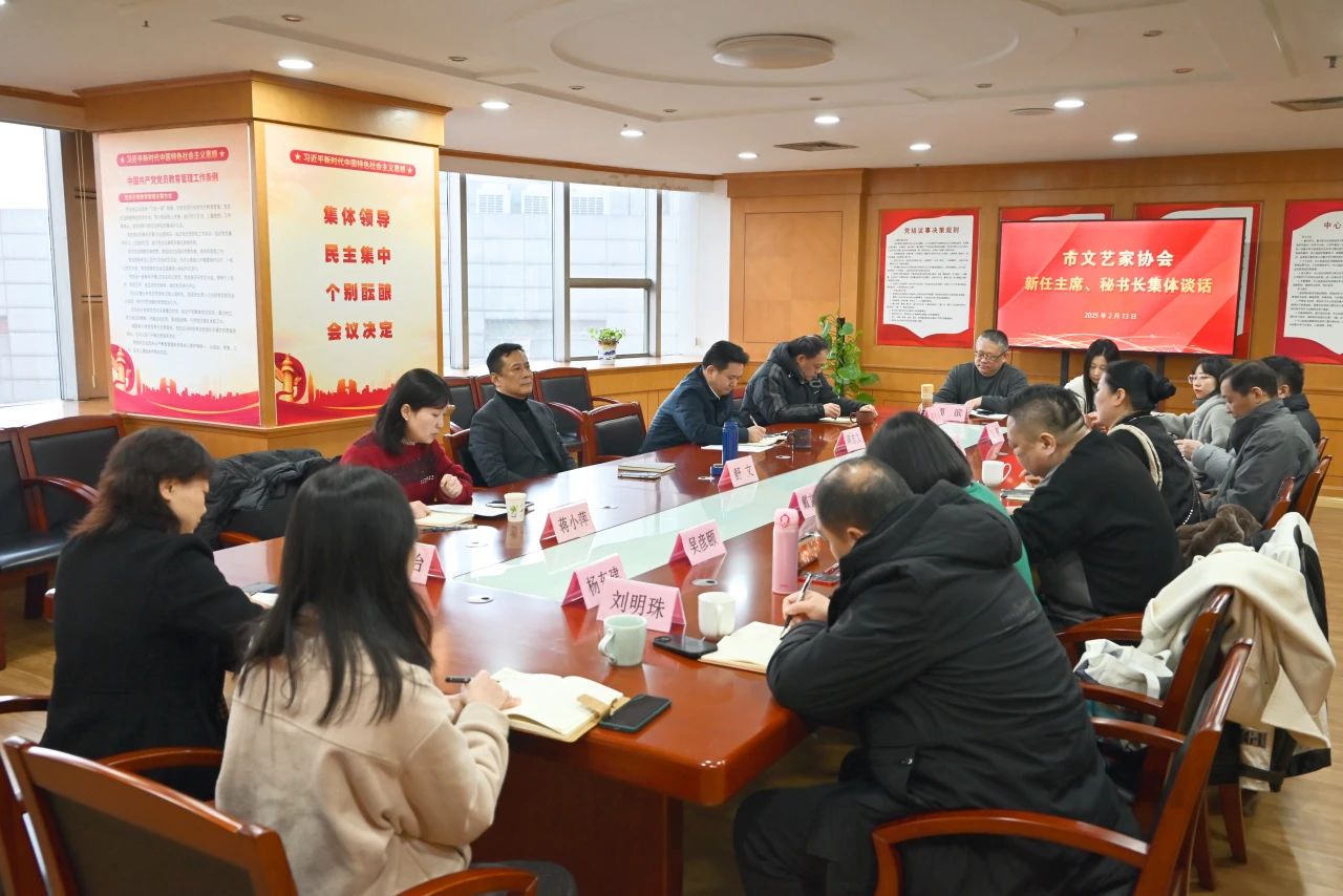 2月13日上午,常州市文联召开文艺家协会新任主席、秘书长集体谈话会,市文联全体领导出席会议。市书法家协会、市摄影家协会、市花鸟画研究会、市文艺评论家协会等协会新任主席(会长)、秘书长参加会议。会议由市文联党组成员、副主席蒋志文主持。