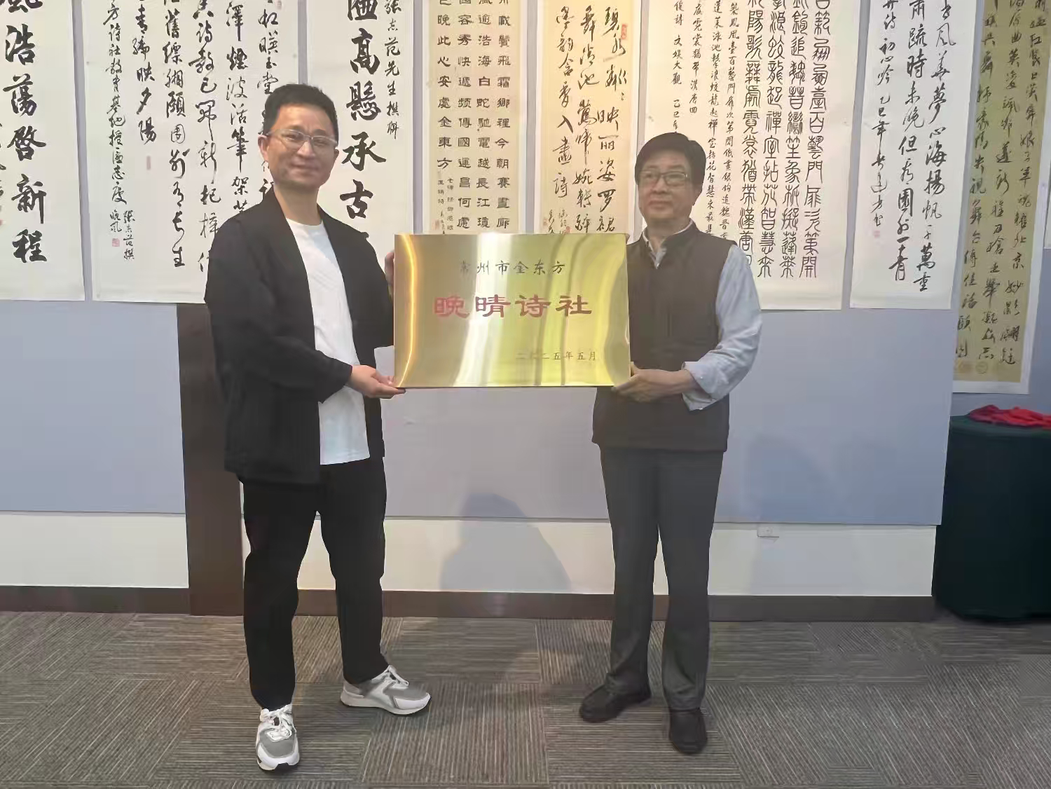 5月10日,常州市晚晴诗社在金东方颐养中心书画室揭牌成立。市诗词协会主席潘一新、市民间艺术家协会主席马士勇及社区负责人代表与会。会议由晚晴诗社新任社长张志范主持。