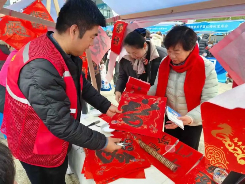 新春送福是集中行动的特色环节。2026年1月6日,常州市文联在三井街道文体中心的惠民服务市集设置春联书写台,书法志愿者笔走龙蛇,将美好期许凝于笔端,现场为居民书写并赠送春联、福字共计300余副。活动现场红纸铺展、墨香四溢,居民们或挑选心仪词句,或提出个性化需求,在笔墨书香中感受传统年俗魅力,提前收获新春祝福。