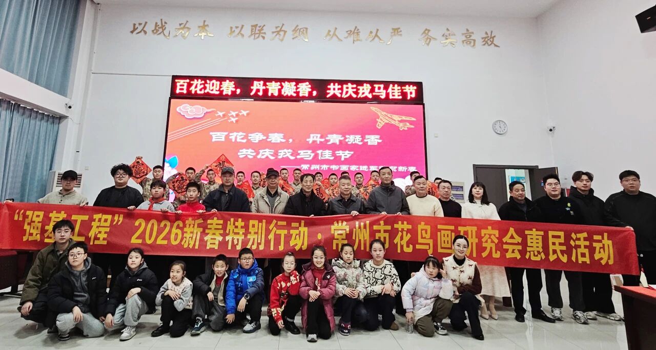 1月29日下午,常州市花鸟画研究会新春惠民活动走进常州某部,为驻地官兵送上佳节祝福。
